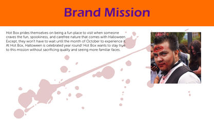 My task was to help Hot Box with their overall design and company goals. I only had the name and target audience to work with. Everything else was decided by me. What I hoped to achieve was to have Hot Box be a place that celebrates not just the holiday of Halloween, but the culture of it as well. From the colors to the imagery, I feel this was accomplished. Hot Box is a place where Horror fans are guaranteed a thrilling time.
